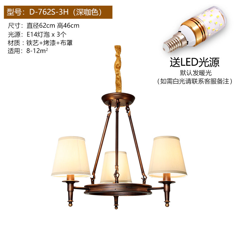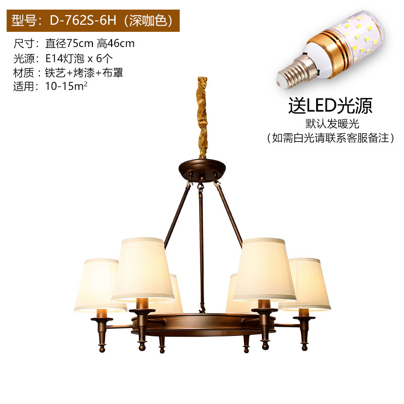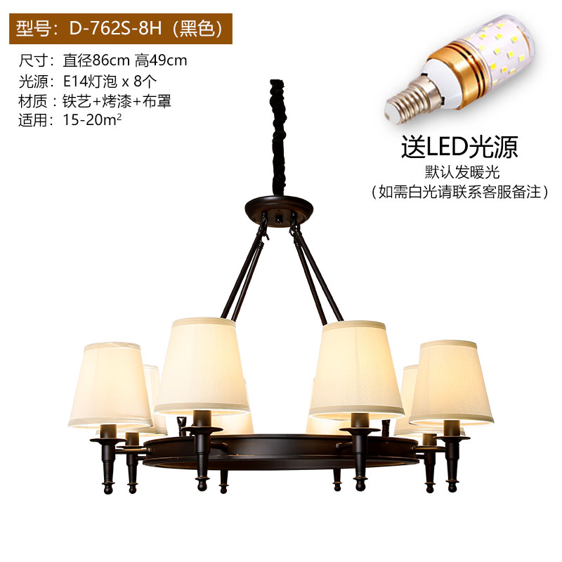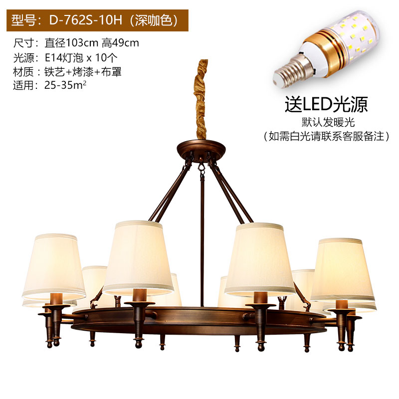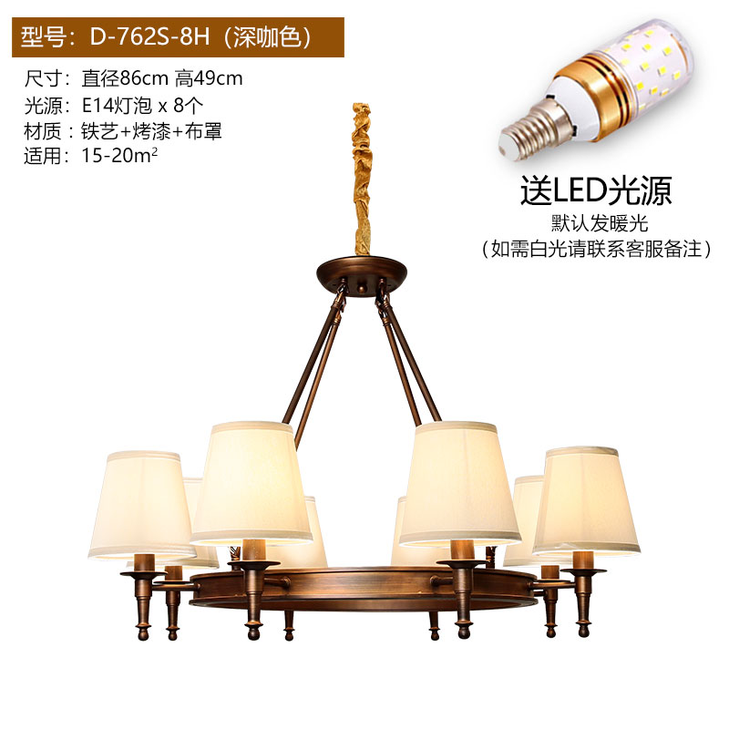 Огни положить американскую страну Простая европейская гостиная Homelight крупномасштабной ресторан спальня ретро кованые железа американская люстра 10 черных (отправка светодиодной лампы) Сертификат №.: 2021181001019641\nСтатус сертификата: эффективный\nНазвание продукта: фиксированное общее освещение (висит / созерцание, накаливание / сам - болотный светодиод, IP20, IP20, может быть установлен на поверхности обычных горючих материалов, E27 / E14)\n3C Спецификация модели: см. Приложение. 220-240 В ~ 50/60 Гц.\nБренд: свет будет\nМодель: D-762S-8H\nСтиль: Американский простой\nЦвет: 3 Глубокий COF Цвет (Отправить Светодиодная лампочка) 6 Глубокий COF Цвет (Отправить СИД лампочки) 8 Глубокий COF Цвет (Отправить Светодиодная лампочка) 10 Глубокий COF Цвет (Отправить СИД лампы) 3 Черный (Отправить СИД лампы) 6 Черный Светодиодная лампочка) 8 черных (отправить светодиодную лампочку) 10 черных (отправка светодиодной лампочки) 3 глубокого цвета COF (отправка трехцветной лампочки лампы) 6 глубокий COF COF (отправьте трехцветное светодиодное светодиодное лампочку) 8 глубокий COF COF (отправьте три Цветная лампочка) 10 Deep Cof Color (отправить трехцветную лампу лампочки) 3 черных Трехцветная светодиодная светодиодная лампочка) Пакет темный кофе (отправить трехцветный светодиодный источник света) пакет B темный кофейный цвет (отправить Sany-цвет светодиодный источник света) пакет C глубокий прозрачный цвет (отправить Sany-цвет светодиодный источник света)\nБудь лампа со светом источником: нет\nГородская служба: То же самое Городская логистика Доставка\nНапряжение: 111 В ~ 240 В (в том числе)\nОсвещение основного материала: железо\nКрышка лампы Основной материал: ткань\nТип источника света: лампы накаливания светодиодная лампа\nПроцесс: распылительная картина\nДимидзор Площадь: 15м2-130м2\nТип управления: другое\nАксессуары для крышки лампы: ткань\nКачественный период страхования: 5 лет\nПлетеный материал: железо\nИнтеллектуальный тип: не поддерживает интеллект\nБудь то интеллектуальные манипуляции: нет\nФорма освещения: люстра\nЗаголовок света: 8\nТип люстры: железная люстра
