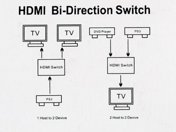 Переключатель HDMI- 2HDM : ● Длина входного и выходного кабелей входного кабеля HDMI может достигать 5 метров. Даже если кабель длинный, нет потери сигнала или проблемы с передачей данных. Кабель всегда поддерживает высокую пропускную способность 3,4 Гбит / с. ● Максимальный рабочий ток составляет 15 мА, HDMI-переключатель V1.4 соответствует всем спецификациям HDMI V1.0, V1.1, V1.2, V1.3, V1.4, V2.0 ● Не нужно беспокоиться о визуальных и звуковых характеристиках, несколько HDMI Коммутатор обеспечивает передачу сигнала без потерь, в том числе аудио и видео. Наслаждайтесь самым роскошным видео и аудио ● Благодаря захвату HDMI он поддерживает различные форматы видео, такие как 3D, 1080p, разрешение 2K x 4K и звук HD. ¡ HDMIMI Switch имеет широкий спектр применения. Switcher доступен для всех устройств с портами HDMI, таких как ПК, ноутбуки, игровые приставки, XBox 360, Xbox One, PS3, PS4, проекторы, ТВ-приемники, телевизоры и т. Д. ● Переключатель HDMI- 2HDM очень полезнен для домашнего использования, особенно если у вас несколько устройств. Простота в использовании Большинство устройств в этой категории не очень маленькие, но устройства выделяются ● Концентратор переключателя HDMI поддерживает функцию «подключи и работай». Внешний источник питания не требует и может быть подключен только через кабель HDMI. ● Переключатель HDMI необходим только для переключения сигналов. Внешнего источника питания нет. Устройство ввода должно иметь токовый вход для нормальной работы. (Большинство воспроизводящих устройств с интерфейсом HDMI подключено к внешнему источнику питания, а выходной интерфейс HDMI имеет ток).
