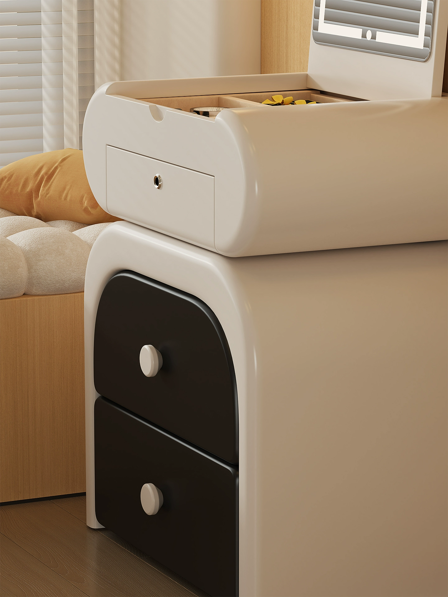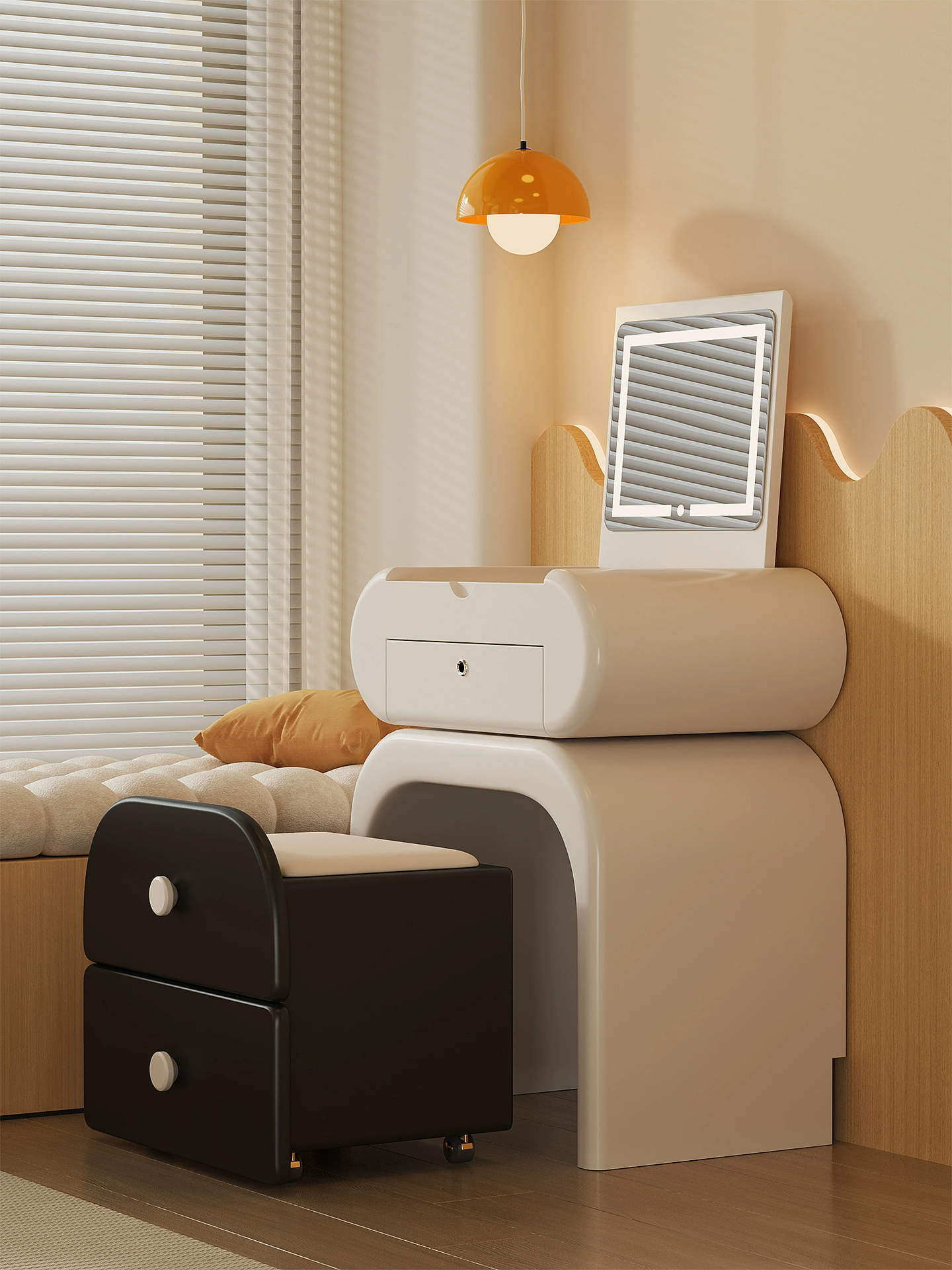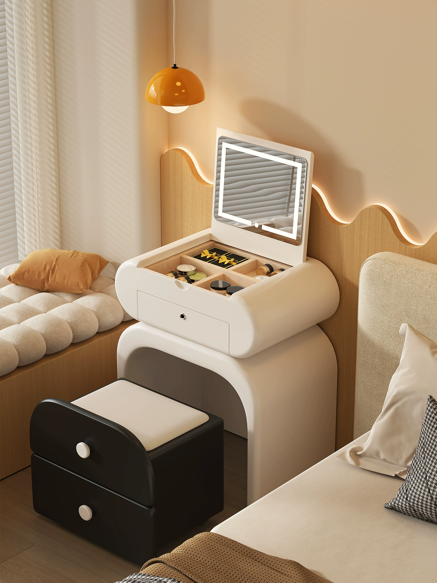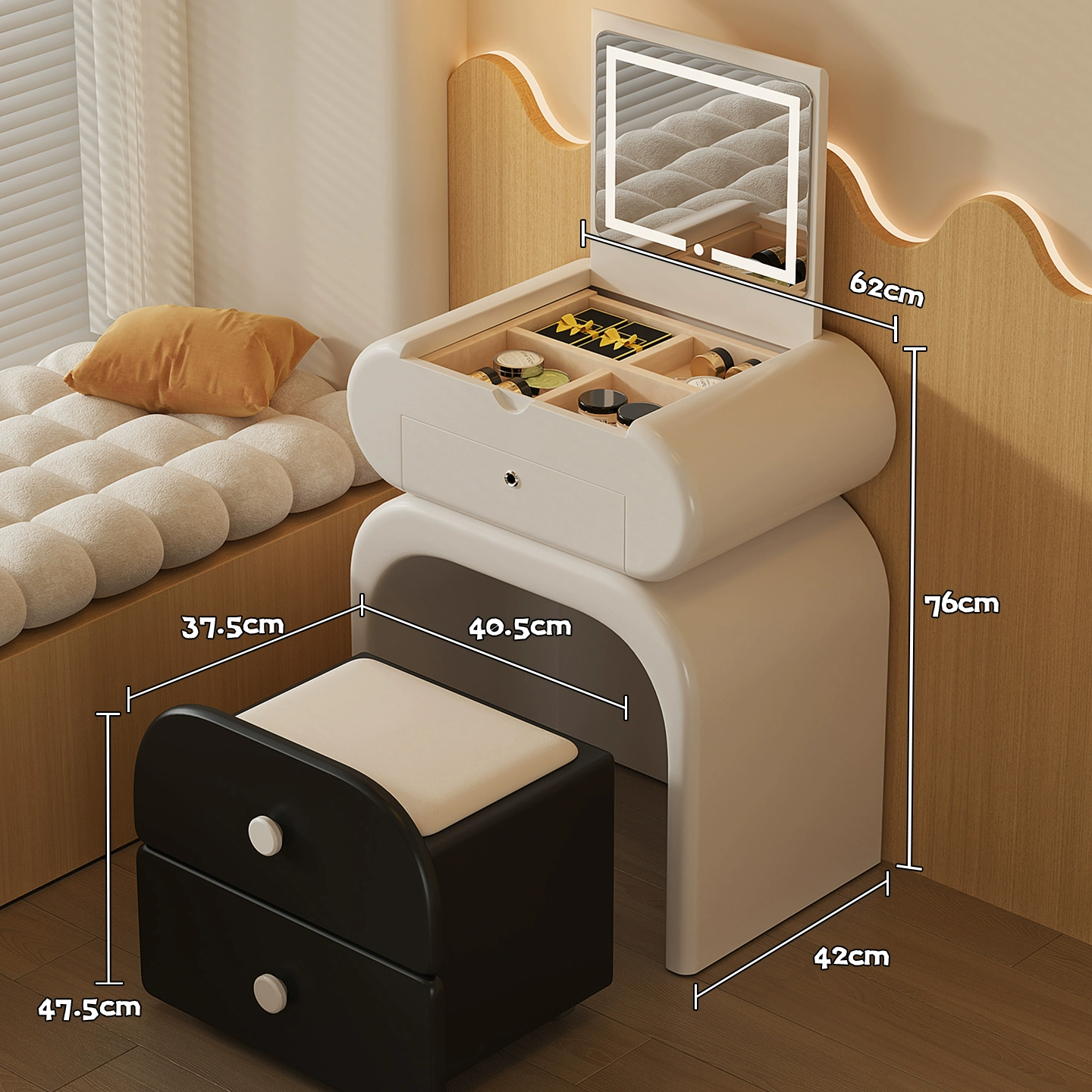 Туалетный стол Nyx в нежном кремовом оттенке — идеальное сочетание современного дизайна и функциональности. Его лаконичные формы и натуральная массивная столешница привносят в интерьер уют и теплоту, создавая атмосферу легкости и спокойствия. Квадратное зеркало шириной 50 см идеально дополнит ежедневный уход за собой, а компактные размеры (40,5 × 76 × 42 см) позволяют разместить стол даже в небольшой комнате. Практичность Nyx подчеркивается одним вместительным ящиком и открытой полкой — достаточно места для хранения косметики и аксессуаров. Легкая конструкция на двух ножках создает визуальное ощущение воздушности, а в комплекте идет удобный пуф, который завершает элегантный образ этого туалетного стола. Мебель из Гонконга отличается качественным исполнением и продуманной эргономикой. Если вы цените стиль и комфорт, Nyx станет незаменимым элементом вашего уютного уголка красоты. Добавьте этот кремовый туалетный стол к себе домой и наслаждайтесь вдохновляющей обстановкой каждый день. Если остались вопросы — напишите нам в чат. Мы всегда на связи и с удовольствием поможем разобраться во всех нюансах.