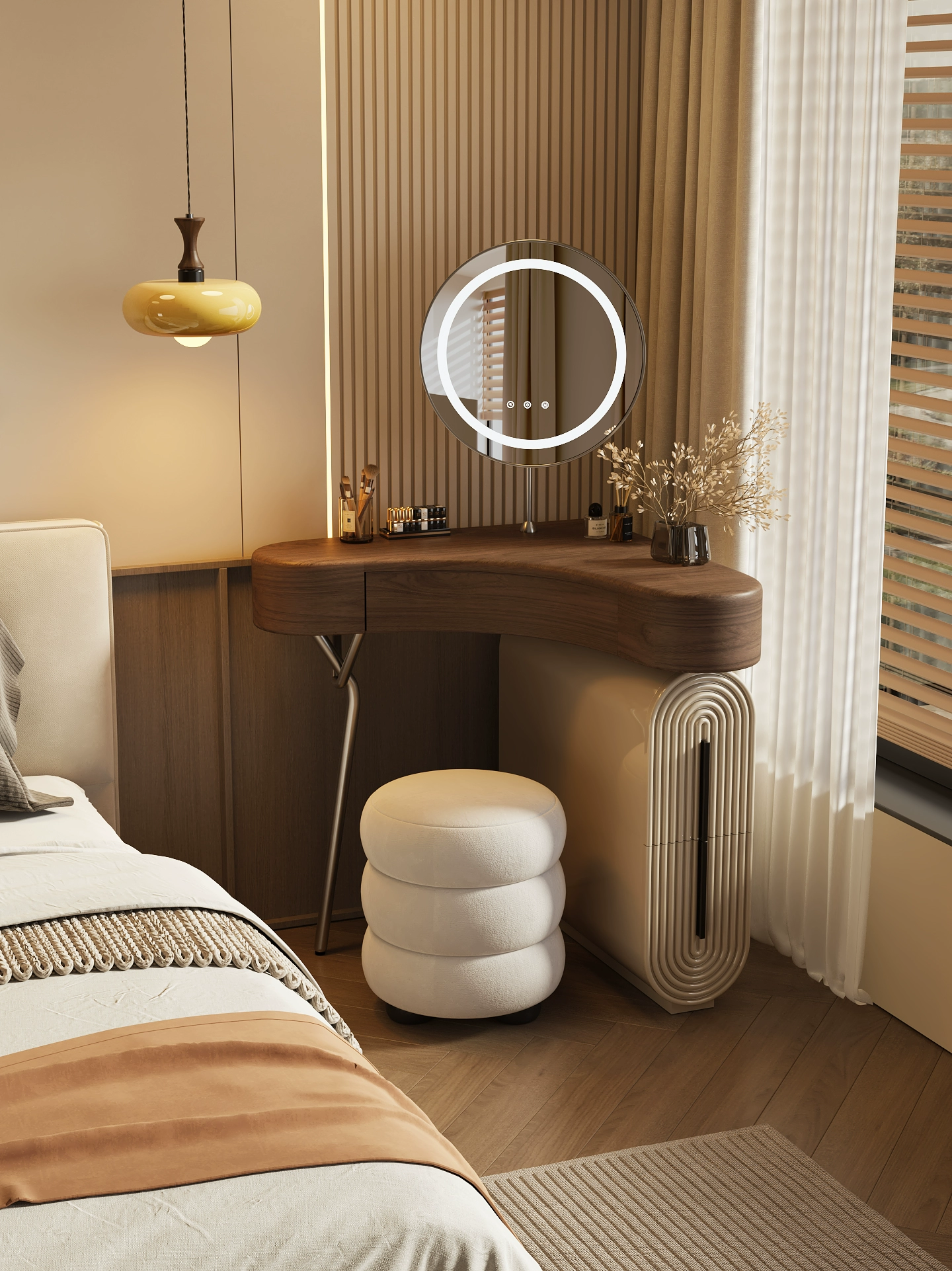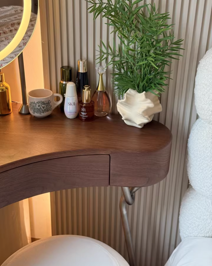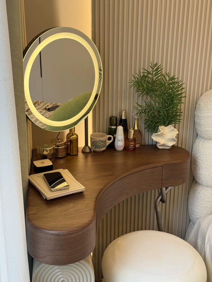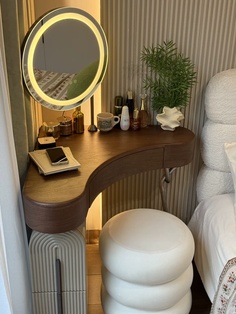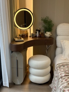 Дизайнерский туалетный столик с зеркалом для себя - откройте идеальное сочетание современного дизайна и функциональности в нашем туалетном столике с зеркалом в тёплом ореховом оттенке. Компактные размеры 70×75,5×70 см, высота туалетного столика делают его универсальным решением для любого интерьера, а круглая зеркальная поверхность диаметром 40 см добавляет мягкости и уюта в пространство. Столешница из качественного дерева не только радует глаз натуральным рисунком, но и служит надёжной основой для вашей косметики и аксессуаров. Металлическое основание с одной ножкой придаёт конструкции легкость и визуальную воздушность, а практичный ящик и открытая полка обеспечивают достаточно места для хранения важных мелочей. В комплекте идёт стильный пуф, который гармонично дополняет образ, создавая полноценное место для утреннего ритуала красоты. Какой туалетный столик выбрать? - конечно который собирается легко — оно поставляется в разобранном виде, что удобно для доставки и размещения даже в небольших комнатах. Если этот туалетный столик с зеркалом купить - он станет изящным акцентом в вашей спальне или гардеробной, где каждая деталь важна. Почувствуйте баланс эстетики и удобства — добавьте его в корзину и начните преображать свой интерьер уже сегодня. Если остались вопросы — напишите нам в чат. Мы всегда на связи и с удовольствием поможем разобраться во всех нюансах.
